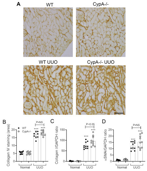 Renal fibrosis in day 7 UUO kidney compared to normal controls for WT (closed circles) and CypA−/− (open circles) mice. (A) Immunoperoxidase staining for collagen IV in the different groups. Bar = 100 μm. (B) Quantification of the area of interstitial collagen IV staining. RT-PCR for mRNA levels of: (C) collagen I and (D) α-SMA/ACTA2. Data are mean ± SD. *** p < 0.0001 versus WT sham control; NS, not significant.