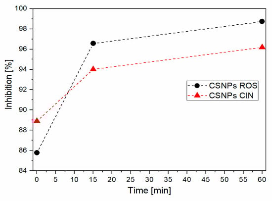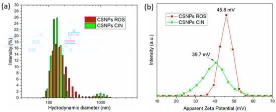 ZP, as an indicator of the prepared dispersion stability, was quite high in the case of both prepared dispersions, and from a theoretic point of view, it exceeded the absolute value of 30 mV that can be regarded as a stable dispersion with minimum sedimentation [39]. The ZP of ROS and CIN-embedded CSNPs corresponded to 45.8 and 39.7 mV, respectively (Figure 1b). The high positive value of the ZP in both cases is the consequence of protonated amino groups from CSNPs at pH 4 that exhibit highly positive charge, and at the same time indicates successful incorporation of extracts into the interior of the CSNPs and the accessibility of the CS amino groups [40]. Nevertheless, some polyphenols may have been also present at the surface of the CSNPs, and this may be the reason why the CSNPs CIN exhibit a smaller absolute ZP in comparison to the CSNPs ROS. Subsequently, the ZP results are in agreement with the hydrodynamic diameter and size distribution of both dispersions.