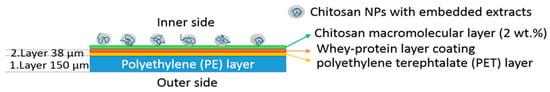 The results of the electrokinetic properties and particle size of CSNP colloidal formulations with embedded extracts showed a successful formation of particles in the nano range with a high positive charge. As such, they were deposited on the inside of the whey-based laminate, as shown schematically in Figure 2, where the structure of the entire protein-based laminate is shown. PE and PET layer were interconnected using an adhesive and the inner side is supposed to be in contact with the food. Following this, the modified whey-based laminate prepared in this way was further subjected to various physicochemical characterizations, as discussed below.
