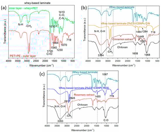 Attenuated Total Reflection–Fourier Transform Infrared (ATR-FTIR) spectra of different layers of whey-based laminate film structure is shown in (a); IR spectra of pristine, extracts, chitosan and the modified whey-based laminate film for the 2%CS+CSNPs CIN is shown in (b); and the whey-based laminate film with the deposited 2%CS+CSNPs ROS is shown in (c).