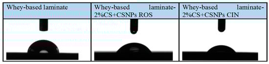 Based on the static contact angle (SCA) results, the hydrophilicity/hydrophobicity of the whey-based laminate surface was determined. The reduction of the contact angle is of great importance for practical application, as the hydrophilic surface of the packaging material reduces the potential process of condensation (antifogging efficiency) in contact with food. Dew point condensation can significantly worsen packaging conditions and thus increase food contamination [27]. To maintain food quality, it is important to prevent this process. The results of SCA measurements are presented in Table 1 and in Figure 4.