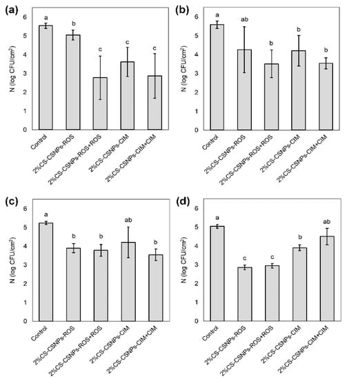 Besides active compounds bound to whey films, the antimicrobial character also depends on the surface chemistry of the composite materials, such as hydrophobicity, amount of charge, available amino groups on the surfaces, roughness, etc. From the above results, it was observed that the sample 2%CS + CSNPs CIN has a lower contact angle and higher band intensities (ATR-FTIR) for amino groups compared to the 2%CS + CSNPs ROS. This may indicate that the amount of amino groups and hydrophilicity may play a slightly more important role in inhibiting bacteria than fungi. Furthermore, it also depends on the roughness and coating homogeneity, which is similar for both samples, however, an even rougher morphology was obtained for the whey-based laminate applied with the 2%CS + CSNPs ROS layer (Figure 5c). It appears that higher roughness is more correlated with fungal inhibition than bacterial inhibition.