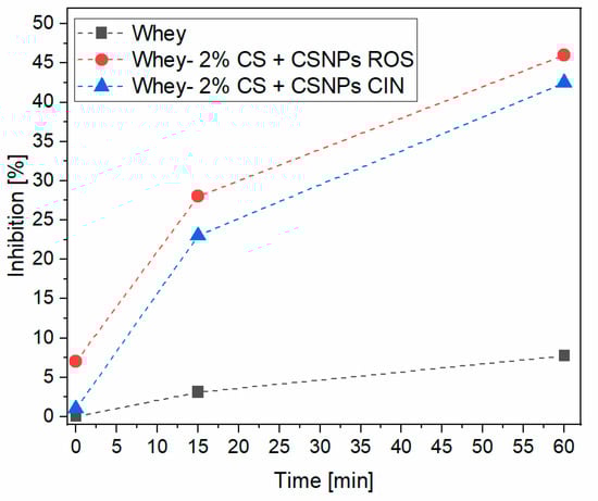 Figure 7 shows the results of the antioxidant activity for liquid formulations; i.e. CSNPs ROS and CSNPs CIN. It is clearly seen that both formulations have a high antioxidant activity (more than 90% inhibition) established after 15 minutes. When these formulations were applied as a coating onto whey laminate films, as shown in Figure 8, more time was needed to efficiently influence the oxidative process inhibition, mainly due to the release process. It is also observed that pristine whey-based laminate has no antioxidant capacity. After 1 hour of testing, the coatings maintain a quite good antioxidative capacity of around 40% for whey-based laminate+2%CS + CSNPs CIN and 5% for whey-based laminate + 2%CS + CSNPs ROS.