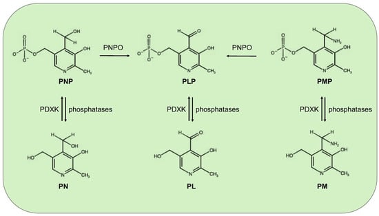 Mammals, different from microorganisms, are not able to synthesize PLP but recycle it through a salvage pathway from B6 vitamers as pyridoxal (PL), pyridoxamine (PM), and pyridoxine (PN) contained in food []. In the cytoplasm PL, PM, and PN are converted into the 5′-phosphorylated vitamers through pyridoxal kinase (PDXK), while the FMN-dependent pyridoxine 5′-phosphate oxidase (PNPO) converts PNP and PMP into PLP (Figure 1). Once ingested, PLP, PNP, and PMP are dephosphorylated by the tissue-non-specific alkaline phosphatase (TNSALP), which is anchored to the cell membrane. Then, PM, PN, and PL are absorbed from the upper small intestine by a carrier-mediated system and is delivered to the liver. Here, they are converted to PLP, thanks to the combined action of PDXK and PNPO. From the liver, PLP bound to albumin, along with dephosphorylated B6 vitamers, reach the peripheral tissues through the blood stream. In order to enter cells, PLP needs to be dephosphorylated again by TNSALP []. In the cytosol, a ubiquitous PLP phosphatase is instead required for vitamin B6 catabolism [].