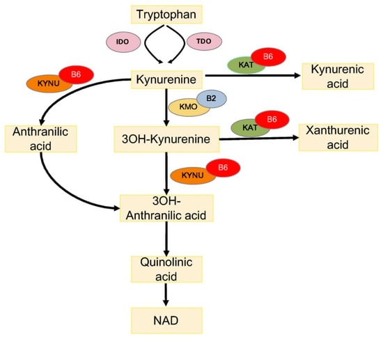 Tryptophan metabolism via the kynurenine pathway. IDO, indoleamine 2,3-dioxygenase; TDO, tryptophan 2,3-dioxygenase; KAT, kynurenine aminotransferase; KMO, kynurenine 3-monooxygenase; KYNU, kynureninase; 3OH-kynurenine, 3-hydroxy kynurenine; 3OH-anthranilic acid, 3-hydroxyanthranilic acid; B6, vitamin B6 (pyridoxal 5′-phosphate); and B2, vitamin B2 (flavin adenine dinucleotide).
