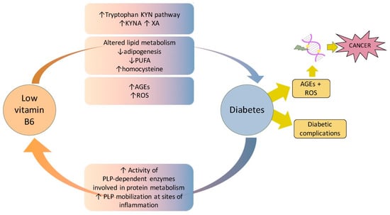 Epidemiological, clinical, and experimental studies have indicated an association between low-grade inflammation and both T1D [] and T2D [,]. Moreover, the role of inflammation in the pathogenesis of T2D and vascular complications was confirmed by intervention studies []. In diabetic patients, an inverse relationship between plasma PLP and inflammation markers was found []. Therefore, it was proposed that in diabetes, the decline in PLP levels might be due to (1) the mobilization of this coenzyme to the site of inflammation; (2) increased demand by the PLP-dependent enzymes involved into the tryptophan kynurenine pathway; and (3) immune cell proliferation []. However, more research is needed to confirm these mechanisms.