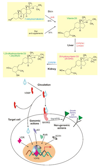 Vitamin D metabolism and effects in humans. Vitamin D3 is synthesized in skin from 7-dehydrocholesterol in a reaction catalyzed by solar UVB and can be delivered with food. In the circulation, it is bound by vitamin D binding protein (VDBP) and can reach liver, where is metabolized by cytochrome P450 family 2 subfamily R member 1 and family 27 subfamily A member 1 (CYP2R1 and CYP27A1) to 25-hydroxyvitamin D3 (25(OH)D), which is converted by CYP24A1 to 1,25-dihydroxyvitamin D3 (1,25(OH)2D, a blue tear) in a reaction that occurs mainly in kidney microtubule. 1,25(OH)2D is a biologically active metabolite of vitamin D that may interact with its transmembrane membrane-associated rapid response steroid-binding (MARRS) receptor and affect signaling, nuclear proteins and other transmembrane receptors, including growth factors (non-genomic action). 1,25(OH)2D may associate with its nuclear receptor Vitamin D receptor (VDR), which induces its heterodimerization with retinoid X receptor (RXR) and binding other proteins, including sequestosome 1 (p62/SQSTM1) and steroid receptor coactivator 1 (SRC1), to bind vitamin D response elements in the promoters of hundreds of genes to regulate their expression (genomic action).