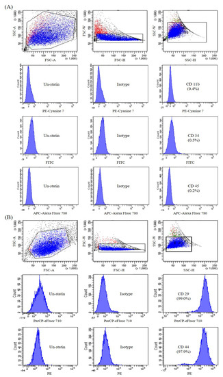Fluorescence-activated cell sorting (FACS) analyses of mesenchymal stem cell MSC)-conjugated control isotype IgG or antibodies against indicated cell-surface proteins. MSCs were negative for CD11b, CD34, and CD45 (A) and positive for CD29 and CD44 (B).