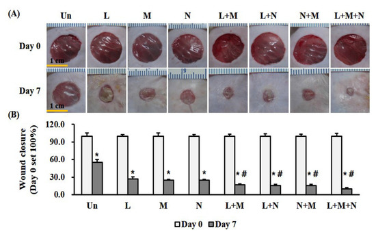 To analyze the wound size, images were obtained using a digital camera (Nikon, Tokyo, Japan) on days 0 and 7 after wound formation. Quantification of wound closure was performed using ImageJ software (National Institutes of Health, Bethesda, MD, USA) normalized with the wound size at day 0 as 100% (https://imagej.nih.gov/ij).