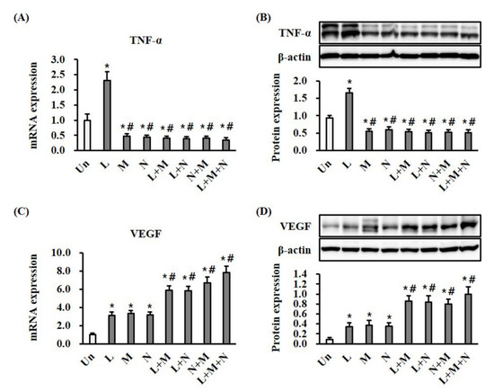 To determine whether the mono- or combination therapy modulated inflammation, we measured the expression of TNF-α, a proinflammatory cytokine, using RT-qPCR and Western blotting in wound tissues (Figure 3A,B). Monotherapy with LTP significantly (p < 0.05) increased the mRNA and protein expression of TNF-α at day seven compared with the control (Figure 3A,B). Monotherapy with NPWT and MSC, and combination therapy with LTP + MSC, LTP + NPWT, MSC + NPWT, and LTP + MSC + NPWT, significantly (p < 0.05) decreased the mRNA and protein expression of TNF-α compared to the control (Figure 3A,B). There were no statistically significant differences between monotherapy and combination therapy groups. The expression of VEGF, an angiogenesis marker, in wound tissue was investigated at day seven. Monotherapy with LTP, MSC, and NPWT significantly (p < 0.05) increased both the mRNA and protein expression of VEGF compared with the control (Figure 3C,D). Compared to monotherapy, combination therapy with LTP + MSC, LTP + NPWT, MSC + NPWT, and LTP + MSC + NPWT significantly (p < 0.05) increased both the mRNA and protein expression of VEGF (Figure 3C,D).
