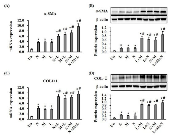 α-SMA expression and collagen deposition may predict wound-healing progress. Monotherapy with LTP, MSC, and NPWT significantly (p < 0.05) increased both the mRNA and protein expression of α-SMA and type I collagen in wound tissue at day seven compared with the control (Figure 4A,B). Compared with monotherapy, combination therapy with LTP + MSC, LTP + NPWT, MSC + NPWT, and LTP + MSC + NPWT significantly (p < 0.05) increased both the mRNA and protein expression of α-SMA and type I collagen (Figure 4A,B).