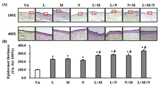 Mice were euthanized by inhalation of CO2 gas at day 21 after wounding, and tissue samples were excised, including the complete epithelial region around the wound. The tissue samples were then immediately fixed in 4% neutral-buffered formalin overnight at 4 °C and placed in 30% sucrose for 72 h. Subsequently, they were embedded using an O.C.T. compound (Sakura Finetek, Torrance, CA, USA) in cryomolds, placed in liquid nitrogen, and stored in a deep freezer until use. The cryo samples were cut into sections 10 μm thick using a cryostat (Leica Biosystems, Nussloch, Germany). After drying at RT, the sections were fixed in cold methanol, washed for 5 min with PBS, stained for 10 min with Mayer’s hematoxylin (Cancer Diagnostics, Inc., Durham, NC, USA), and then stained for 30 s with eosin solution (Cancer Diagnostics, Inc.) at RT. Finally, they were cover-slipped with an aqueous mounting medium (Dako, Santa Clara, CA, USA). The images were obtained using microscopy (Leica Microsystems GmbH, Wetzlar, Germany), and the epithelial thicknesses were measured using Leica Application Suite X software (Leica, Microsystems GmbH).
