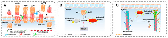 A schematic overview of a hypothesised pathway that GSK-3 is involved in the phosphorylation of tau: (A) The sequential cleavage process of amyloid precursor protein (APP) in the amyloidogenic and non-amyloidogenic pathway in Alzheimer’s disease (AD). In the amyloidogenic pathway, the extracellular domain of APP is firstly cleaved by β-secretase, liberating a soluble extracellular N-terminus fragment sAPPβ and a transmembrane fragment AP-C99. The remaining APP-C99 is further cleaved by γ-secretase, generating β-amyloid (Aβ) and releasing APP intracellular domain (AICD) into cytosol. In the non-amyloidogenic pathway, APP is cleaved by α-secretase and γ-secretase, releasing sAPPα, P3, and AICD. (B) One possible pathway of the activation of GSK-3. After binding with Fe65, AICD directly or indirectly activates GSK-3 by removing the phosphorylation from serine site (Ser9 of GSK-3β and Ser21 of GSK-3α). The activation of GSK-3 can be inhibited by GSK-3 inhibitor such as lithium. (C) GSK-3 phosphorylates microtubule-associated protein tau (MAPT). Tau is involved in the stabilisation of microtubules and axonal transport. After being abnormally phosphorylated by activated GSK-3, hyper-phosphorylated tau detaches from microtubules and causes the dissociation of microtubules.