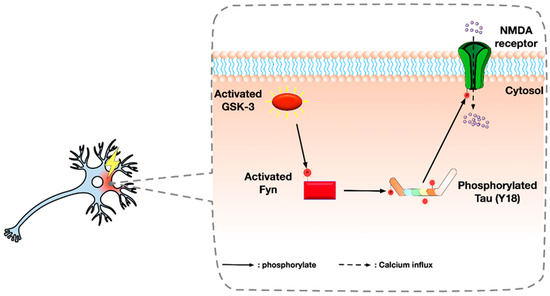 In addition, studies showed that GSK-3 might be involved in AD-associated seizures through alternate pathways. Multiple studies have shown that GSK-3β can be associated with the activity of Fyn [73,74,75], a tyrosine kinase involved in mediating seizure susceptibility through activation of N-methyl-D-aspartate (NMDA receptors which is an ion channel modulating the influx of calcium [76]. Fyn could phosphorylate a unique site Tyr18 (Y18) of tau [77], and Y18-phosphorylated tau is implicated in tau-related NMDA receptor overactivation and excitotoxicity in vitro [78]. Y18-phosphorylated tau subsequently over-activates NMDA receptors and causes excitotoxicity and eventually seizures. Taken together, these results might lead to another pathway of seizure development that involves GSK-3 in AD (Figure 2). However, it is worth mentioning that evidence in physiological condition is required to prove this hypothesis. Studies in AD animal models are also important to connect the dots among GSK-3, Fyn, and AD.