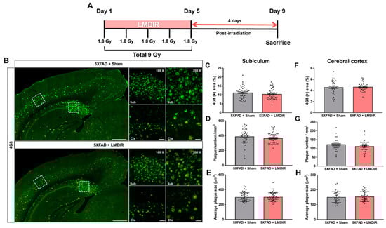 It has been shown that LDIR at a dose rate of 2 Gy/fraction for 5 days significantly reduced amyloid plaque deposition in the brains of Aβ-overexpressing transgenic mice at 2 months post irradiation []. To examine the short-term effect of LMDIR on Aβ accumulation in the brain, we estimated Aβ burden in the brain sections of sham- and LMDIR-exposed 5XFAD mice at 4 days post irradiation (Figure 1A and Supplementary Figure S1). Aβ plaques were stained with an anti-4G8 antibody, and analyzed by area fractions, number and average size in the subiculum and the cerebral cortex (Figure 1B–H). The depositions of amyloid plaques in radiation-exposed 5XFAD were not significantly different compared with sham-exposed 5XFAD mice at 4 days after LMDIR over 5 days. For the first time, we demonstrated that LMDIR had no significant short-term effect on Aβ pathology in the Aβ-overexpressing transgenic mice.