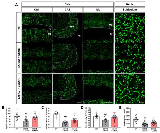 The loss of synapses and neurons is a major pathological feature of AD which is known to cause memory loss []. Although LDIR has been shown to reduce Aβ42-induced neuronal death in Drosophila models of AD [], no study has investigated the neuroprotective or synapto-protective effects of LDIR in Aβ-overexpressing rodent models. Therefore, we examined the expression of synaptic and neuronal marker proteins in the brains of 4-month-old 5XFAD mice, which exhibit no cognitive deficits []. To visualize axon terminals and neuronal cells, we immunohistochemically stained brain sections from the animals with synaptophysin (SYN) and neuronal nuclear antigen (NeuN), respectively (Figure 2A). The histological analysis revealed that 5XFAD mice showed a decrease of both SYN immunoreactivity in the hippocampus (Figure 2B–D) and fewer NeuN-positive cells in the subiculum (Figure 2E) of 5XFAD mice, compared with wild-type mice. However, the LMDIR-treated 5XFAD mice exhibited significant increase in SYN immunoreactivity and NeuN positive cells compared with sham-treated 5XFAD mice (Figure 2). These findings suggest that exposure to LMDIR significantly reduced synaptic and neuronal loss in brains with Aβ.