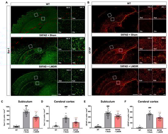 Chronic accumulation of Aβ in the brain induces neuroinflammation, which is characterized by the activation of microglia and astrocytes []. In addition, glial activation can promote the release of pro-inflammatory cytokines, which further aggravates Aβ-induced neurodegeneration [,]. To examine the effect of LDIR on glial responses in the AD brain, we performed immunohistochemical staining for microglial and astrocytic markers in the brains of 5XFAD mice. Ionized calcium-binding adaptor molecule 1 (Iba-1) and glial fibrillary acidic protein (GFAP) were employed as markers of microglia and astrocytes, respectively (Figure 3A,B). The number of Iba-1- and GFAP-positive cells in the subiculum and cerebral cortex was significantly higher in the 5XFAD mice than in the wild-type mice (Figure 3C–F). In contrast, the number of microglia and astrocytes was significantly lower in the LMDIR-exposed 5XFAD mice than that in the sham-exposed 5XFAD mice (Figure 3C–F). In addition, we investigated the microgliosis in the subgranular zone (SGZ) and subventricular zone (SVZ) (Supplementary Figure S2). We confirmed that LMDIR-exposed 5XFAD mice exhibited a significantly lower number of Iba-1-positive cells in both SGZ and SVZ than that of sham-exposed 5XFAD mice. Taken together, these results demonstrated that short-term LMDIR exposure significantly reduced both microgliosis and astrogliosis in the brains of animal models of AD.