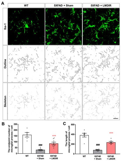 Upon microglial activation by AD pathogenesis, infection or any other neurodegenerative stimulus, microglial cells retract their ramification and transform into amoeboid or spherical shape []. Activated microglia produce pro-inflammatory cytokines and lead neurotoxicity [,]. To confirm that microglial morphology changes after LMDIR in AD, we analyzed the processes of Iba-1-positive cells in the 5XFAD mouse brain using the ImageJ program. We found microglial morphology changes though quantitative outcome of both skeleton and fractal analysis (Figure 4). The number of microglial process endpoints and the length of process in the subiculum was significantly lower in the 5XFAD mice than that in the wild-type mice (Figure 4B,C). In contrast, the number of microglial process endpoints and length of process in the subiculum was significantly higher in the radiation-exposed 5XFAD mice than that in the sham-exposed 5XFAD mice. These findings suggest that exposure to LMDIR significantly affects change of microglial morphology in brains with Aβ.