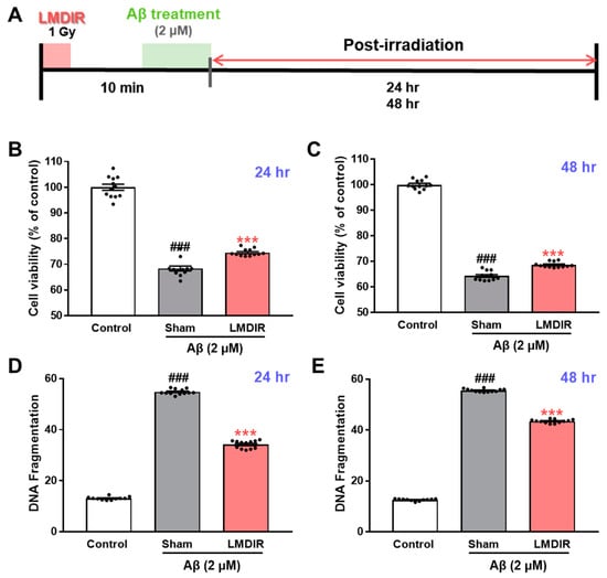 Direct neuroprotective effect of LMDIR against Aβ toxicity in cultured neuronal cells. (A) Outline of the experimental design. SH-SY5Y cells were exposed to LDIR (1 Gy), and then incubated with 2 μM Aβ for 24 or 48 h. (B,C) Cell viability was measured using an MTT assay. The cell viability of the LMDIR- and Aβ-treated SH-SY5Y cells was significantly higher than that of the sham- and Aβ-treated SH-SY5Y cells 24 and 48 h after irradiation. (D,E) Cell death was evaluated by measuring DNA fragmentation using an ELISA kit. The DNA fragmentation in LMDIR- and Aβ-treated SH-SY5Y cells was significantly lower than that of sham- and Aβ-treated SH-SY5Y cells 24 h and 48 h after irradiation. Data are presented as mean ± SEM. ### p < 0.001: control versus sham-exposed SH-SY5Y cells. *** p < 0.001: sham-exposed SH-SY5Y cells versus LMDIR-exposed SH-SY5Y cells. LMDIR, low–moderate dose ionizing radiation; Aβ, amyloid-β.