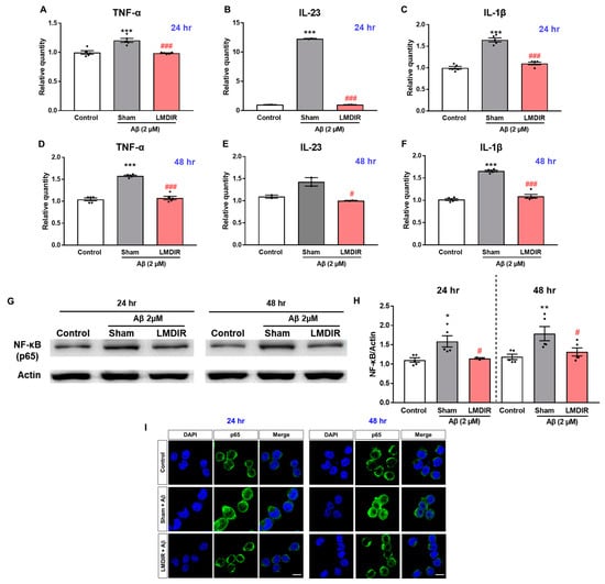 In a previous study, LDIR reduced the levels of pro-inflammatory cytokines, particularly TNF-α, in an AD animal model []. To further examine the inhibitory effect of LDIR on the production of pro-inflammatory molecules by Aβ-activated microglia, we measured the mRNA levels of pro-inflammatory cytokines in Aβ- or/and LMDIR-treated microglial cells. Sham-irradiated BV-2 cells treated with Aβ for 24 or 48 h exhibited increased TNF-α, IL-23 and IL-1β levels compared to control cells not treated with Aβ (Figure 6A–F). In contrast, LMDIR significantly inhibited the transcription of pro-inflammatory cytokines in Aβ-treated BV-2 cells (Figure 6A–F). For the first time, we demonstrated that LMDIR therapy has a direct anti-inflammatory effect on the Aβ-treated mouse microglia BV-2 cell line. Interestingly, it has been widely known that pro-inflammatory cytokine production is dependent on the NF-κB pathway []. In order to identify the signaling pathways involved in the anti-inflammatory effect of LMDIR in Aβ-treated microglia, we investigated the expression of p65 NF-κB using Western blot analysis. LMDIR inhibited the Aβ-induced upregulation of p65 NF-κB in BV-2 cells, compared with the sham- and Aβ-treated BV-2 cells (Figure 6G,H). Moreover, LMDIR markedly reduced the Aβ-mediated increase of expression and nuclear translocation of NF-κB p65 compared with the sham- and Aβ-treated BV-2 cells (Figure 6I). These results suggest that LMDIR may inhibit the Aβ-induced production of neuroinflammatory cytokines by microglia by suppressing NF-κB pathways.