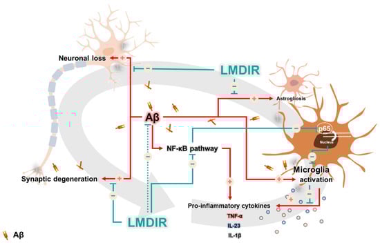 In AD, neuronal loss and synaptic generation are caused by both Aβ and Aβ-mediated neuroinflammation [,]. Microglia activated by Aβ are able to produce neurotoxic pro-inflammatory cytokines such as IL-23, IL-1β and TNF-α []. In addition, the pro-inflammatory cytokine TNF-α is thought to be involved in the pathophysiology of AD by promoting abnormal Aβ production, synaptic degeneration and neuronal death []. Moreover, degenerating neurons may also directly activate microglia by secreting microglial activators such as laminin and matrix metalloproteinase-3 (MMP-3) []. This self-perpetuating cycle between degenerating neurons and activated microglia promotes the progression of AD (Figure 7). Furthermore, this continuous and vicious cycle can also contribute to cognitive impairment, a symptom of AD. Thus, an intervention that promotes the destruction of this vicious cycle may effectively inhibit the progression of AD. Surprisingly, previous studies have shown that LDIR strongly suppressed neuronal death in an Aβ-overexpressing Drosophila model [] and reduced microglial activation in the ApoE−/−AD mouse model []. Consistent with previous studies, we demonstrated that LMDIR significantly ameliorated neuronal death and neuroinflammation both in vitro and in vivo (Figure 2, Figure 3, Figure 4, Figure 5 and Figure 6). Notably, for the first time, we demonstrated that LMDIR inhibited synaptic loss, astrogliosis and NF-κB pathway activation in models of AD. To the best of our knowledge, our study is the first to demonstrate the neuroprotective and anti-inflammatory effects of LMDIR, suggesting that LMDIR can inhibit the vicious cycle which is established between degenerating neurons and activated microglia in AD. Nonetheless, our in vitro and in vivo results regarding the effect of LMDIR on neuroprotective and anti-inflammatory effect should be interpreted with caution.