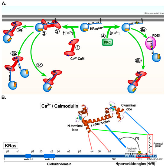 Despite these still unresolved matters and based on the currently available literature, the HVR domain of KRas is critical for the interaction with Ca2+/calmodulin. This interaction can prevent PKC-mediated Ser181 phosphorylation in the PBR domain of KRas. Vice versa, phosphorylation of KRas by PKC at this Ser181 residue blocks Ca2+/calmodulin to interact with KRas [16,29,107]. This interplay between PKC-mediated KRas phosphorylation and KRas/calmodulin interaction is an imperative mechanism to modulate KRas activity and downstream signalling [123] and will be discussed in the next section.