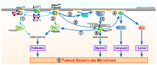 Model of calmodulin and protein kinase C (PKC) modulating critical features of KRas-driven tumourigenesis. This hypothetical model is based on studies comparing the impact of pharmacological compounds modulating PKC or calmodulin activity in a variety of cell models expressing wild-type or oncogenic and constitutively active KRas (KRasG12V) containing Ser181-phosphomimetic or non-phosphorylatable mutants (see Section 3.4.3 for further details) [16,29,105,121,169,170]. (1) Ca2+/calmodulin binding to the polybasic region (PBR) within the hypervariable region (HVR) of KRas inhibits PKC-mediated Ser181 phosphorylation of KRas (P-Ser181) by sterical hindrance. Complex formation of calmodulin with (active) KRas-GTP may segregate KRas to membrane microdomains where KRas-GTP could be more susceptible to GTPase activating protein (GAP)-mediated KRas inactivation. This ensures KRas inactivation and termination of KRas-GTP-mediated activation of phosphoinositide 3-kinase (PI3K) effector pathways. (2) Low Ca2+ levels disrupt KRas/calmodulin interaction and favor PKC-mediated Ser181 phosphorylation of KRas. (3) This allows a conformational change in P-Ser181 KRas and is followed by its segregation to distinct plasma membrane microdomains or endosomal membranes (omitted in this scheme), where interaction and activation of effectors like PI3K can occur. (4) Ser181 phosphorylation of oncogenic KRas (KRasG12V) triggers PI3K and Akt-dependent anti-apoptotic signals driven by B-cell lymphoma 2 (bcl2) and mammalian target of rapamycin complex (mTORC) that promote survival and cell growth, respectively. (5) PI3K also activates Rac1 guanine nucleotide exchange factors (Rac1 GEFs) that promote activation of Rac1 (Rac1-GTP) on plasma (or endosomal) membranes (dashed lines). The membrane location of phosphatidyl-4,5-biphosphate (PIP2) and phospharidylinositol-3,4,5-triphosphate (PIP3) is indicated. (6) Alternatively, active KRas (KRas-GTP) can directly associate with a Rac1-GEF to activate Rac1. (7) Vice versa, active Rac1-GTP and its effector Pak1 have been suggested to facilitate Ser338 Raf1 phosphorylation and activation, which affects proliferation along the Raf1/mitogen-activated protein kinase (MAPK) pathway. (8) Rac1-GTP drives actin dynamics linked to cell migration. (9) These complex regulatory networks are highlighted by the requirement of Rac1 activity in KRas-driven cancers (see Section 5 for further details). Overall, Ser181 phosphorylation of oncogenic KRas is at the forefront of multiple signalling pathways that are fundamental to cellular events that drive tumour growth and metastasis. This can be counteracted by KRas/calmodulin complex formation, providing a potential tool to reduce signal output of oncogenic KRas.