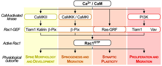 A number of studies established that in neurons and other cell types, cytosolic Ca2+ elevation stimulates the Rac1-GEFs, Tiam1, Kalirin, and β-Pix, in a CaMKII-dependent manner [222,248,249,250,251,252,253]. Using NIH3T3 and Swiss 3T3 fibroblasts, Exton and coworkers identified that platelet-derived growth factor activated and translocated Tiam1 to membrane fractions by CaMKII-mediated threonine phosphorylation that was coupled to phospholipase C (PLC)-driven cytosolic Ca2+ increase [157,158,223].