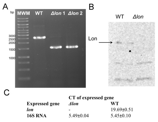 A lon deletion mutant of D. solani was constructed using the gene doctoring method, a modified protocol for lambda red recombination dedicated to the pathogenic bacterial strains. The gene encoding the Lon protease was substituted with the kanamycin resistance cassette, amplified from the pDOC-K plasmid. We confirmed the deletion of lon by three independent methods: (1) detection of the lon sequence on the D. solani chromosome by PCR using the primers complementary to the sequences flanking the lon gene; (2) detection of the lon transcript by real-time PCR; (3) immunodetection of the Lon protein using the anti-E. coli Lon rabbit antibodies. As can be seen in Figure 1, the lon gene and its product were not found in the strain D. solani IPO 2222 Δlon but were present in the WT parental strain.