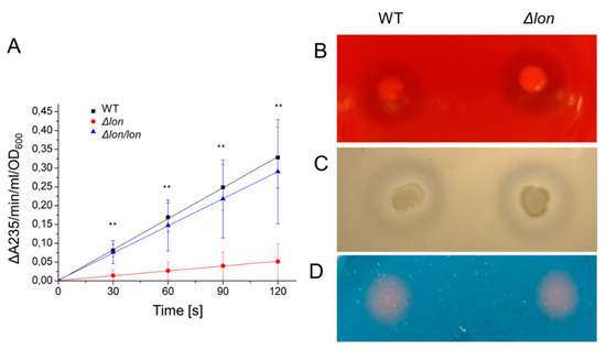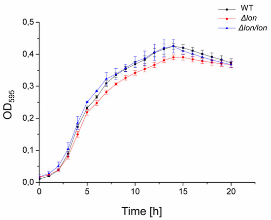 A lack of the lon gene did not affect the growth of bacteria at the standard in vitro conditions (LB medium, 30 °C), as judged from the growth curves. The growth rates of the Δlon, Δlon/lon and WT D. solani cultures were comparable (Figure 2). Similar growth patterns of the Δlon and WT strains have significantly facilitated the normalization of bacterial cultures in terms of age and cell density for subsequent stress sensitivity and pathogenicity tests.