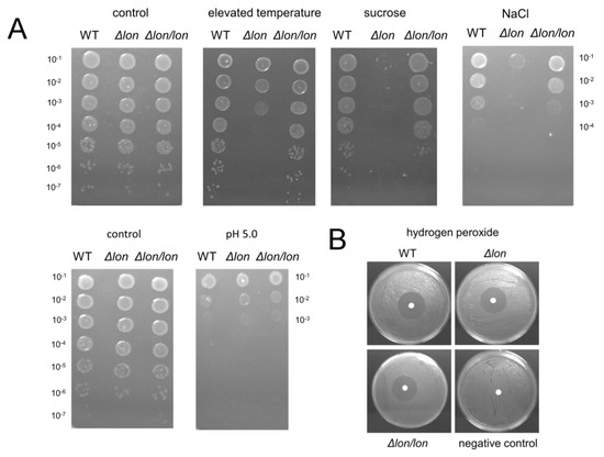Growth of D. solani Δlon under stressful conditions. (A) Overnight grown cultures were serially diluted and spotted on the LA (Luria Agar) agar plates, agar plates supplemented with 0.6 M sucrose or 0.3 M NaCl or on the LA medium adjusted to pH 5.0 when indicated. Bacteria grown on the LA agar plates at 30 °C refer to control. Disk diffusion assay with 1% hydrogen peroxide. As a negative control, sterile water was used (B). All plates were incubated at 30 °C except for the elevated temperature stress (39 °C).