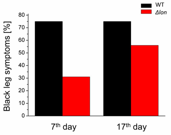 To test the importance of the Lon protease for pathogenicity of D. solani, we performed in vivo infection of the potato plants under greenhouse conditions. This kind of experiment shows the ability of bacteria to invade plants through the root system and produce blackleg symptoms. Although the deletion of the lon gene did not significantly reduce the occurrence of disease, an obvious delay in the development of the disease symptoms was observed. On the seventh day postinfection, only 30% of the potato plants treated with the Δlon mutant bacteria showed blackleg symptoms, compared to 75% of symptomatic plants infected with WT D. solani. On the 17th day, the differences were much less pronounced, with 55% and 75% of symptomatic plants infected with Δlon and WT D. solani, respectively (Figure 5).