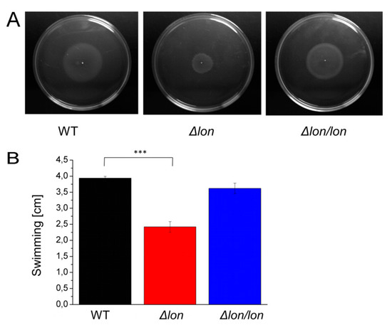 Swarming and swimming motility of D. solani Δlon. (A) Representative pictures of bacteria swarming on 0.8% TSA after 12 h incubation at 30 °C. The experiments were performed at least five times. (B) Swimming was examined in a 0.3% MMA medium for 24 h at 30 °C. The diameter of the bacteria spreading area was measured. Presented data represent values for 5 biological replicates. *** p < 0.001 level (t-test).