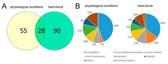 Number (A) and percentage (B) of proteins whose expression level was changed in the Δlon mutant under physiological and heat shock conditions. Data are categorized into 8 groups depending on the protein function. Physiological and heat shock conditions refer to temperatures 30 °C and 40 °C, respectively.