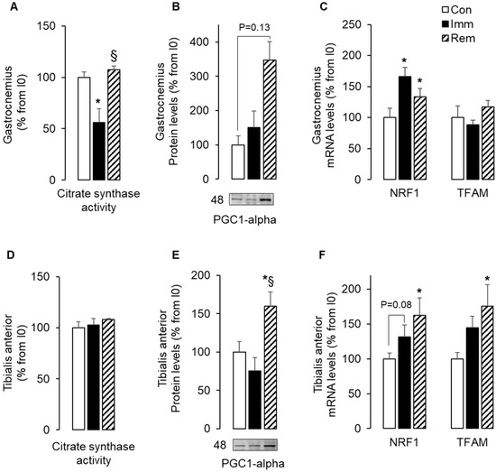 In accordance, Figure 1A shows that citrate synthase activity was reduced in immobilized GA (−45% vs. Con, p < 0.05), suggesting a decrease in mitochondria content. However, this could not be explained by changes in protein or mRNA levels for markers of mitochondria biogenesis (i.e., PGC1-α, NRF1, and TFAM). Indeed, Figure 1B,C show that PGC1-α protein and TFAM mRNA levels did not change during immobilization, whereas NRF1 mRNA levels increased (+65% vs. Con, p < 0.05). After 1 week of GA remobilization, citrate synthase activity returned to basal values (Figure 1A), and this was associated with elevated levels of PGC1-α protein (+250% vs. Con, p = 0.13) and NRF1 mRNA (+33% vs. Con, p < 0.05).