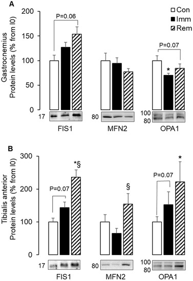 A concomitant increase of mitochondria fusion and fission markers during TA remobilization. Protein levels for FIS1, MFN2, and OPA1 were assessed by Western blots in the GA (A) and the TA (B), quantified and normalized using Ponceau red staining for uneven loading. Several isoforms of OPA1 tune mitochondrial adaptations. Thus, the 2 isoforms detected here were quantified together. Representative Western blots are shown below each graph, and molecular weights are given in kDa. Data were expressed as % from the Con group. Statistical differences were assessed by ANOVA, as described in Materials and Methods. * p < 0.05 vs. Con, § p < 0.05 vs. Imm; Con, non-immobilized rats; Imm, immobilized; Rem, remobilized.