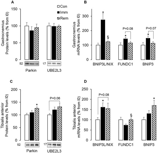 Cells execute mitophagy through two non-redundant mechanisms. The Parkin-dependent pathway involves the E3 ligase Parkin and the ubiquitin-conjugating enzyme—UBE2L3 [32], and the Parkin-independent pathway involves the stress-induced BNIP3, BNIP3L/NIX, and FUNDC1 molecular adaptors [33]. Immobilization of GA did not change the protein levels of Parkin and UBE2L3 (Figure 4A), but resulted in increased levels of BNIP3L/NIX (+175% vs. Con, p < 0.05), FUNDC1 (+43% vs. Con, p < 0.05), and BNIP3 (+48% vs. Con, p < 0.05) mRNAs (Figure 4B). After 1 week of GA remobilization, these mRNA levels returned to basal values (Figure 4B). Figure 4C shows that Parkin and UBE2L3 protein levels did not change during TA immobilization but increased after 1 week of TA remobilization (+26%, p < 0.05 and +33%, p = 0.07 vs. Con, respectively). In addition, only BNIP3L/NIX mRNA levels increased in TA muscles during immobilization (+60% vs. Con, p < 0.05) and remained elevated during remobilization (+54% vs. Con, p = 0.08) (Figure 4D). At the same time, increased mRNA levels for BNIP3 (+70% vs. Con, p < 0.05) and FundC1 (+37% vs. Imm, p < 0.05) prevailed during TA remobilization. Altogether, these data suggested that mitophagy was induced in both muscles during either immobilization or remobilization with a predominant role of the Parkin-independent mechanisms in the immobilized GA and both Parkin-dependent and independent mechanisms in the remobilized TA.