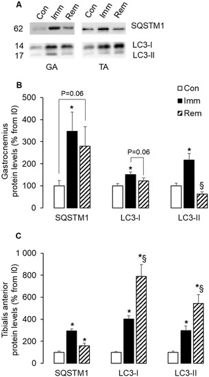 Autophagy was induced during muscle immobilization and remobilization. Protein levels for SQSTM1, LC3I, and LC3II were assessed in GA (A,B) and TA (A,C) muscles by Western blots. Two forms of LC3 were detected (LC3-I and LC3-II) and were quantified separately. Signals were quantified and normalized using Ponceau red staining for uneven loading. Representative Western blots are shown in (A), and molecular weights are given in kDa. Data were expressed as % from the Con group. Statistical differences were assessed by ANOVA, as described in Materials and Methods. * p < 0.05 vs. Con, § p < 0.05 vs. Imm; Con, non-immobilized rats; Imm, immobilized; Rem, remobilized.