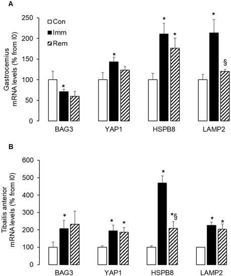 CASA (cross-section area) pathway was largely induced in immobilized and remobilized TA. The mRNA levels for BAG3, HSPB8, LAMP2, and YAP1 were measured in the GA (A) and the TA (B) by RTqPCR and were normalized using 18S rRNA. Data were expressed as % from the Con group. Statistical differences were assessed by ANOVA, as described in Materials and Methods. * p < 0.05 vs. Con, § p < 0.05 vs. Imm; Con, non-immobilized rats; Imm, immobilized; Rem, remobilized.