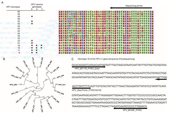 Eighteen genotypes based on the human papillomavirus (HPV) sequence in the L1 region, nucleotide differences, and primer pairs. (A) HPV L1 gene sequences in each of the 18 genotypes (arrows: primer pairs, stars: genotypes of each of the three HPV vaccines). (B) Tree view of HPV L1 pairwise alignment based on building distance matrix by free end gaps (65% similarity (5.0/−4.0)) in each of the 18 genotypes. Distance was obtained from pairwise alignments of all sequence pairs. The genetic distance model was generated using the Tamura-Nei algorithm of Geneious prime 1.8.0_171-b11. (C) Location of the sense/antisense and sequencing primers for genotype 18 of the HPV L1 gene. Black bold arrows are primer locations for pyrosequencing.