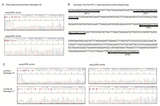 HPV L1 gene sequence in HeLa cells and clinical samples. (A) Direct sequencing analysis of HeLa cells using the GP5+/GP6+ primer pairs. (B) Primer information for direct sequencing. Black bold arrows are primer locations for direct sequencing. (C) Direct sequencing analysis of HPV-positive clinical samples (unit no. 2: genotype 18, unit no. 23: genotype 11).