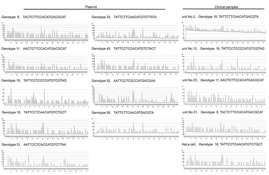 Using the pyrosequencing approach (Figure 1C), we validated the high reproducibility of the genotype identification in nine plasmids carrying the HPV L1 region in HeLa cells (Figure 3). We also successfully genotyped HPV in all positive samples using the clinical mouthwash waste fluids via pyrosequencing (Figure 3).