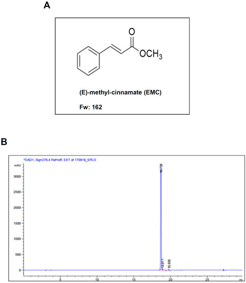 Chemical structure and High-performance liquid chromatography (HPLC) chromatogram of EMC. (A) Chemical structure of (E)-methyl-cinnamate (EMC) isolated from the seeds of Alpinia katsumadai Hayata. (B) HPLC chromatogram of EMC. The results are representative of three independent experiments.