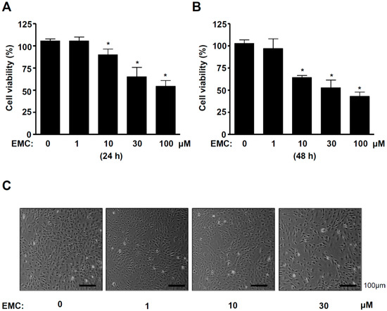 EMC decreases cell survival and induces morphological changes in pre-osteoblasts. (A,B) Pre-osteoblasts were treated with EMC (1, 10, 30, and 100 µM) for 24 h (A) and 48 h (B). Then, cell viability was measured by the MTT assay. (C) The morphological changes were observed under the phase contrast microscopy after treatment with EMC for 48 h. The data are expressed as the mean ± S.E.M. of experiments. * (p < 0.05) indicates statistically significant differences compared to the control.
