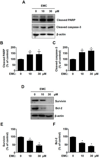EMC induces apoptotic cell death in pre-osteoblasts. (A–C) Pre-osteoblasts were treated in the absence and presence of EMC for 24 h. They were analyzed by western blot analysis with antibodies against the cleaved PARP and caspase-3 (A). β-actin was detected on the same sample to normalize the number of lysates. The levels of the cleaved PARP (B) and caspase-3 (C) were represented as relative percentages of the control. (D–F) The cells were analyzed by western blot analysis using Survivin and Bcl-2 antibodies (D). After normalization by β-actin, the levels of Survivin (E) and Bcl-2 (F) were represented as relative percentages of the control. The data are expressed as the mean ± S.E.M. of experiments. * (p < 0.05) indicates statistically significant differences compared to the control.