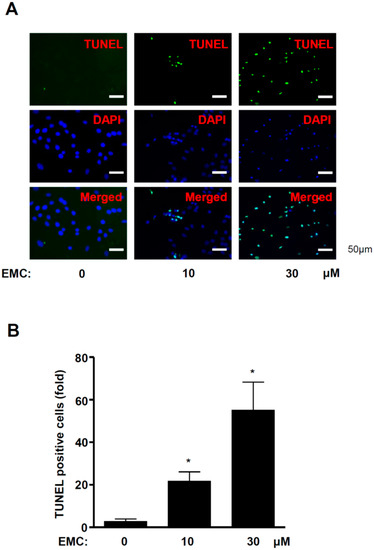 To determine whether the induction of apoptosis caused the inhibitory effects of EMC in pre-osteoblasts, we investigated the expression of apoptotic and anti-apoptotic proteins. EMC significantly increased the cleaved forms of poly (ADP-ribose) polymerase (PARP) and caspase-3 (Figure 3A–C), while it decreased the expression levels of Survivin and Bcl-2 (Figure 3D–F). We also demonstrated the process of apoptosis in pre-osteoblasts by EMC using the terminal deoxynucleotidyl transferase-mediated FITC–dUDP nick-end labeling (TUNEL) assay to detect DNA strand breaks and fragmentation. TUNEL-positive and DAPI-stained cells significantly increased in the presence of EMC in a dose-dependent manner (Figure 4A,B).