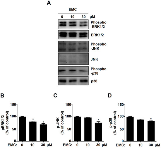 EMC decreases MAPKs signaling in pre-osteoblasts. (A–D) 24 h after EMC treatment, phoshpho-ERK1/2, ERK1/2, phospho-JNK, JNK, phospho-p38, and p38 were detected by western blot analysis. The levels of the phoshpho-ERK1/2 (B), phospho-JNK (C), and phospho-p38 (D) were represented as relative percentages of the control after normalization of the phosphorylation level by the total level (ERK1/2, JNK, and p38). The data are expressed as the mean ± S.E.M. of experiments. * (p < 0.05) indicates statistically significant differences compared to the control.