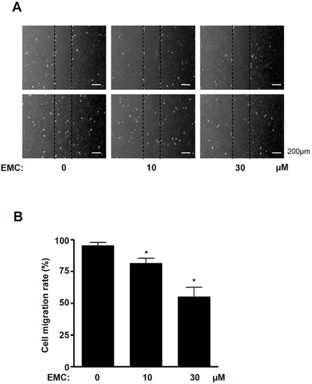 Cell migration was assessed using an in vitro wound-healing assay [39]. The cells wounded with a 200 µL pipette tip were incubated in the absence and presence of EMC for 24 h at 37 °C in a humidified atmosphere of 5% CO2 and 95% air. Cell migration was observed using a light microscope, and the cell migration rate was quantified.