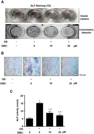 EMC suppresses the osteoblast differentiation of pre-osteoblasts. (A,B) Pre-osteoblasts were cultured in OS containing 50 µg/mL L-AA and 10 mM β-GP in the absence and presence of EMC for 7 days. Then ALP staining was observed by a disital camera (upper) and colorimetric detector (bottom) (A). The individual ALP-stained cells were detected using a light microscope (B). (C) Under the same condition, ALP activity was measured at 405 nm by the Multiskan GO Microplate Spectrophotometer. Scale bar: 100 µm. The results are representative of three independent experiments. The data are expressed as the mean ± S.E.M. of experiments. * (p < 0.05) indicates statistically significant differences compared to the control. # (p < 0.05) indicates statistically significant differences compared to the OS.