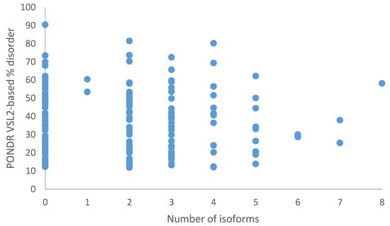 - Romero, P.R.; Zaidi, S.; Fang, Y.Y.; Uversky, V.N.; Radivojac, P.; Oldfield, C.J.; Cortese, M.S.; Sickmeier, M.; LeGall, T.; Obradovic, Z.; et al. Alternative splicing in concert with protein intrinsic disorder enables increased functional diversity in multicellular organisms. Proc. Natl. Acad. Sci. USA 2006, 103, 8390–8395. [Google Scholar] [CrossRef]